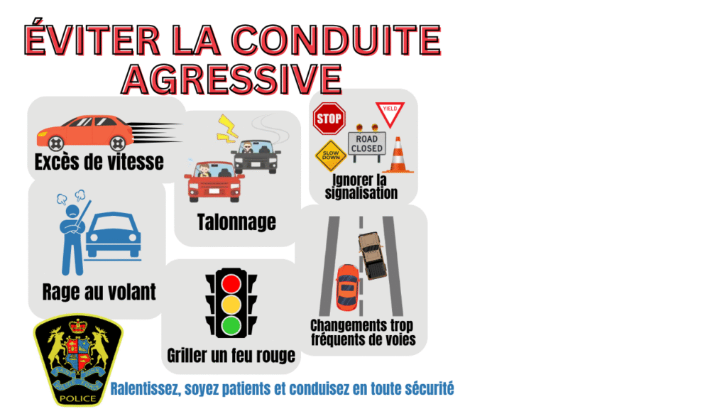 Par l’éducation et l’application de la loi, les agents de la gestion de la circulation intensifieront leurs efforts pour cibler les comportements de conduite agressive qui mettent en danger d’autres personnes ou des biens, comme les excès de vitesse, les talonnages, les changements de voie dangereux, le non-respect des dispositifs de contrôle de la circulation et la conduite sans la prudence et l’attention voulues.