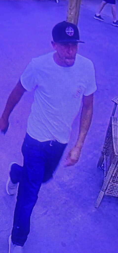 Le suspect, tel qu’il apparaît sur l’image, semble avoir une trentaine d’années et porte un t-shirt blanc et une casquette de couleur foncée.