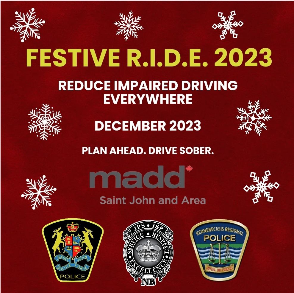 The Saint John Police are partnering with New Brunswick Justice and Public Safety, Kennebecasis Regional Police Force, and the MADD Saint John & Area Chapter to conduct our annual Festive R.I.D.E. Campaign during the month of December to Reduce Impaired Driving Everywhere.