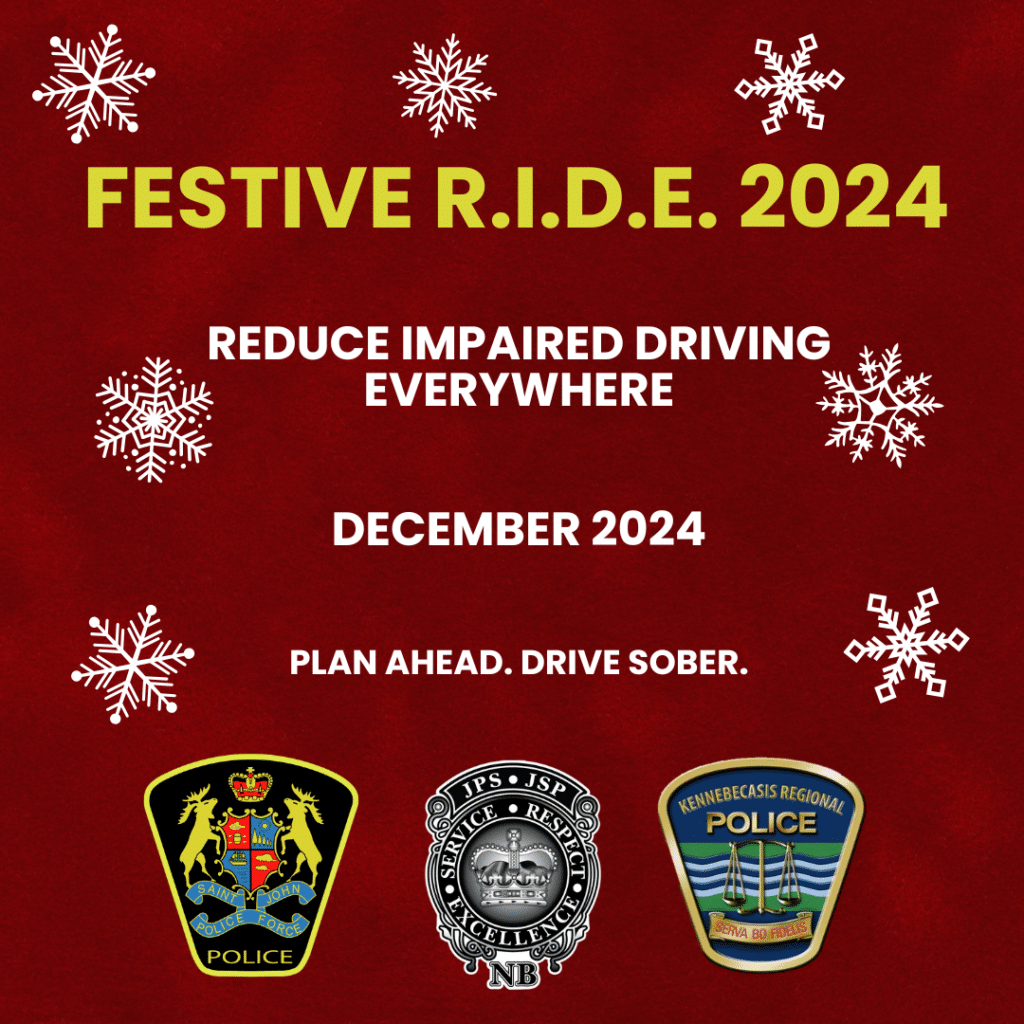 The Saint John Police are partnering with New Brunswick Justice and Public Safety, and the Kennebecasis Regional Police Force to conduct our annual Festive R.I.D.E. Campaign during the month of December to Reduce Impaired Driving Everywhere.