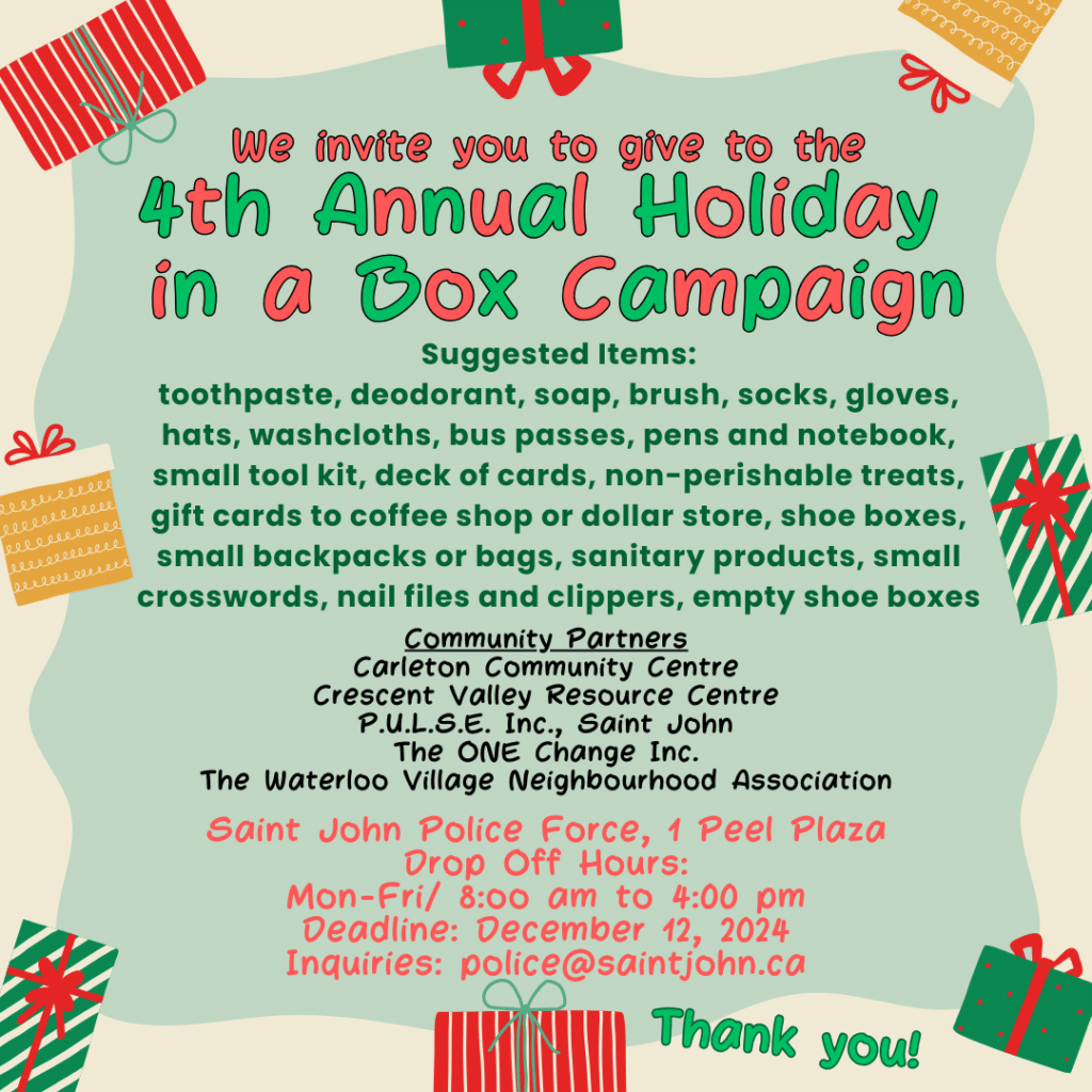 The Saint John Police are proud to launch our fourth annual Holiday in a Box Campaign.