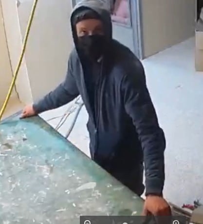 Officers have been unable to ascertain the identity of the suspect, who is described as a male wearing a dark zippered sweater (hood up), a black mask covering the lower half of his face, grey pants, white long socks, and black sneakers.